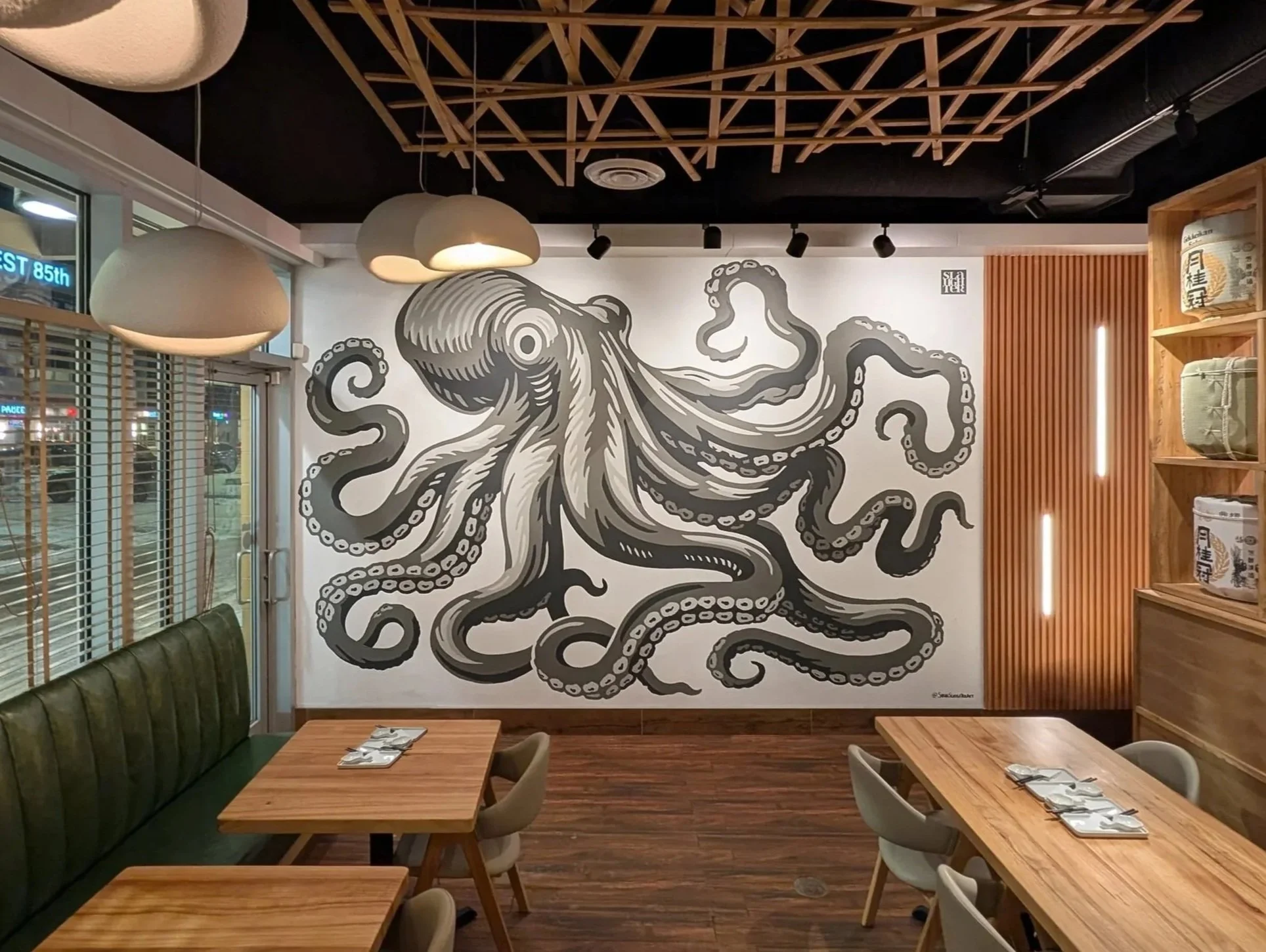 An octopus whose tentacles branch across the wall like a forest, this mural was created for KAJIKI Sushi & Izakaya. The design reflects the layered atmosphere of the restaurant, full of movement and conversation that echoes the energy of the people moving through it.